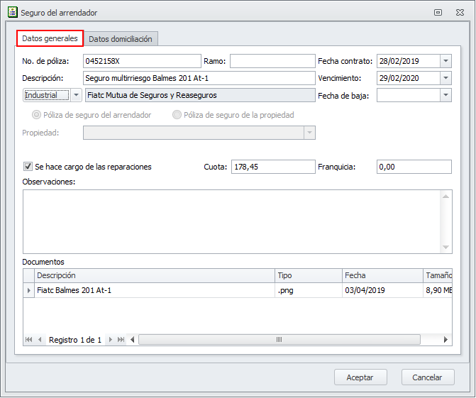 Para revisar el contenido de una ficha, debe hacer doble clic sobre la línea. En Datos generales tiene los datos básicos de la póliza, seguro, mantenimiento o garantía.
