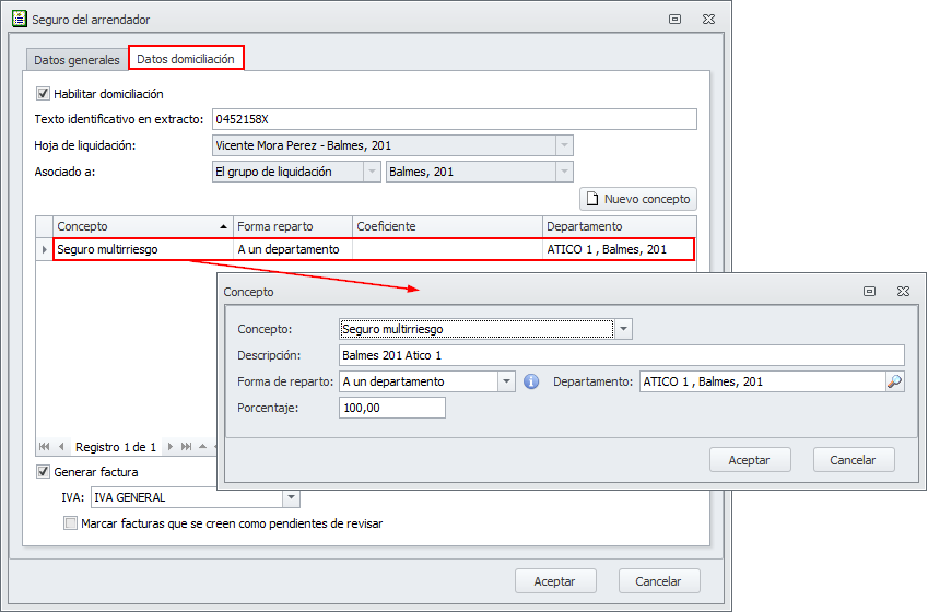 Si existía póliza en adminis, la pestaña Datos domiciliación tendrá activada la casilla Habilitar domiciliación. El resto de datos de la ventana deben indicar la forma de identificar y contabilizar esa ficha.