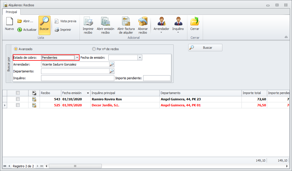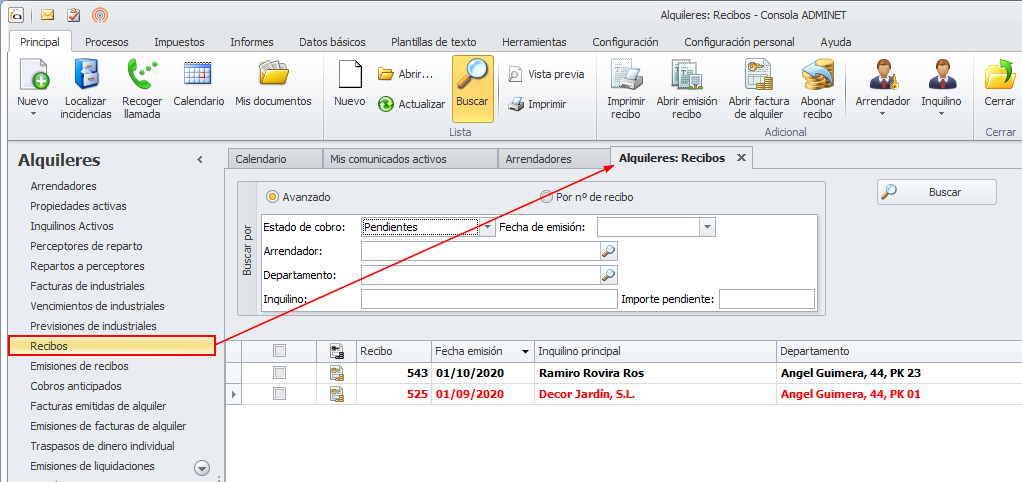 También se pueden consultar todos los recibos pendientes y devueltos de todos los arrendadores, accediendo a la opción Recibos del apartado Alquileres.