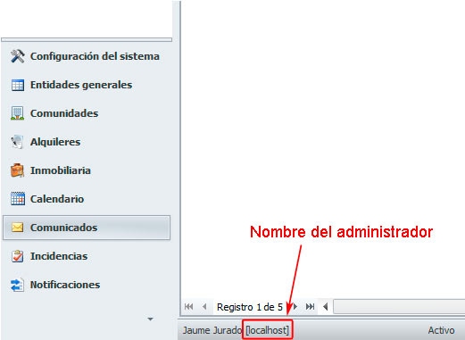 Se muestra el nombre del administrador al que se encuentra conectado el usuario. Este dato está entre corchetes al lado del nombre de usuario en la barra de estado.