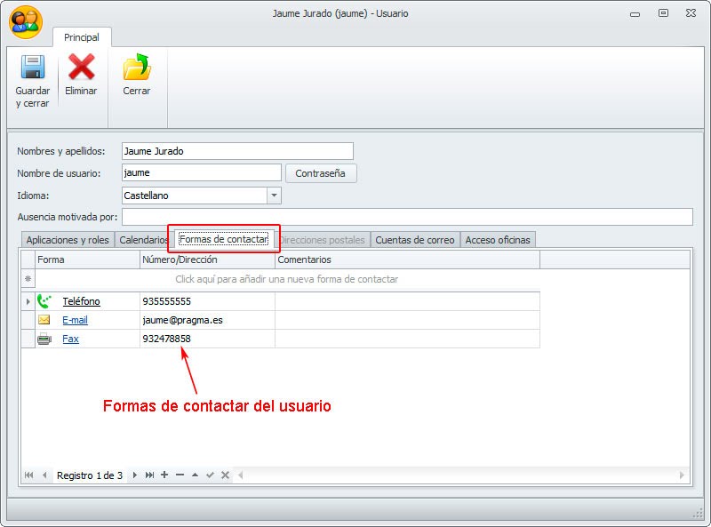 En la ficha del usuario, se agrega una nueva pestaña que permite añadir diferentes formas de contactar al usuario, similarmente como se hace en la ficha de ‘Contactos’. A través de esta opción se permitirá contactar y notificar a los usuarios, anteriormente estaba limitado únicamente a la comunicación vía comunicados.