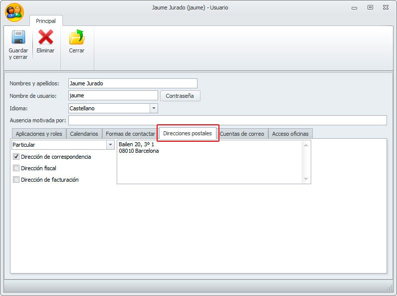 En la ficha del usuario se ha añadido otra pestaña para las direcciones postales.