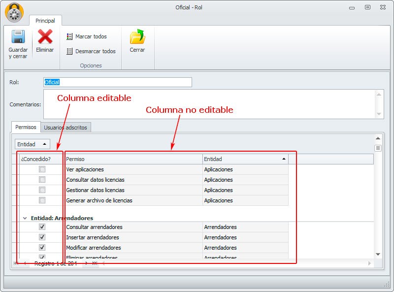 En las listas que se puedan editar y cierta columna no sea editable por el usuario, el color de fondo de la columna se mostrará en un gris claro. De esta forma, el usuario podrá distinguir rápidamente que columnas puede modificar y cuales no.