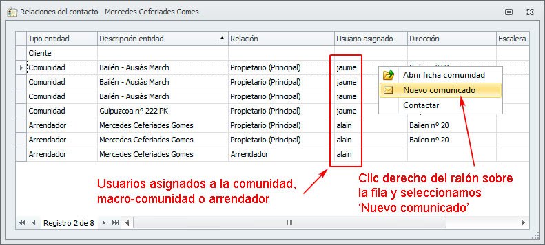 En la lista de relaciones del contacto, se ha añadido un campo donde se muestra el usuario asignado a la comunidad, macro-comunidad o arrendador con el que se relaciona el contacto. Haciendo clic derecho y seleccionando la opción ‘Nuevo comunicado’ se le podrá enviar un comunicado.