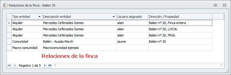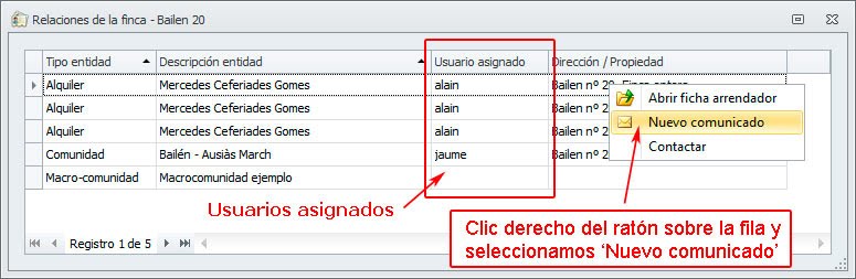 En la lista de relaciones de la finca, se ha añadido un campo donde se muestra el usuario asignado a la comunidad, macro-comunidad o arrendador con el que se relaciona la finca. Haciendo clic derecho y seleccionando la opción ‘Nuevo comunicado’ se le podrá enviar un comunicado.