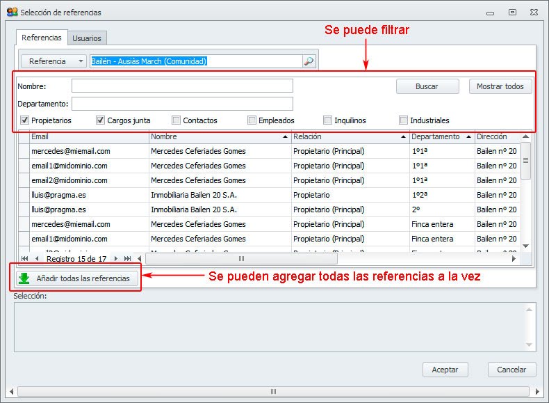 Se ha simplificado el formulario de selección de referencia para el caso que se seleccionen contactos de una comunidad, macro-comunidad o arrendador. Una vez seleccionada la entidad, se muestra una lista con todos los contactos vinculados a la entidad que tengan emails, haciendo doble clic, se puede seleccionar la referencia deseada. Se guarda la configuración de la interficie del formulario. Cualquier cambio que realice el usuario en el tamaño del formulario o altere orden o ancho de las columnas, la próxima vez que vuelva a abrir el formulario se mostrará tal y como lo dejó anteriormente.