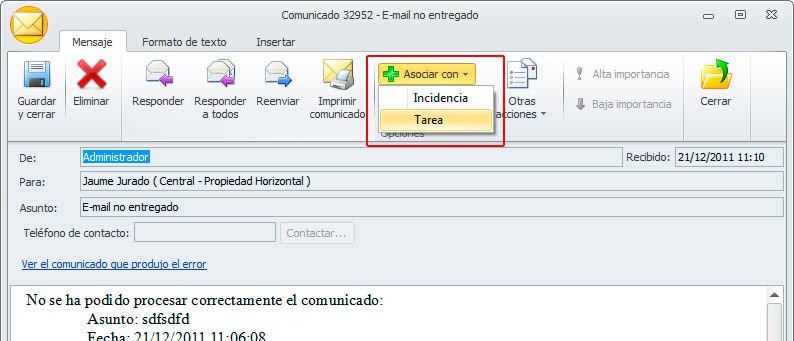 Se puede vincular un comunicado con una tarea. Desde la ficha del comunicado, en el apartado ‘Asociar con’ disponemos de una nueva opción ‘Tarea’. Al hacer clic, muestra un formulario con la lista de tareas disponibles.