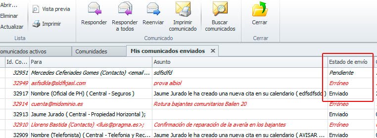 En la lista de ‘Mis comunicados enviados’ se ha ocultado la columna ‘Leído’ y se ha añadido una nueva columna ‘Estado de envío’ que indica los diferentes estados en que puede estar un comunicado enviado: ‘Pendiente’, ‘Erróneo’ y ‘Enviado’. Aquellos comunicados que están pendientes de envío, se muestran con el texto en cursiva.
