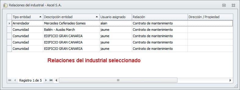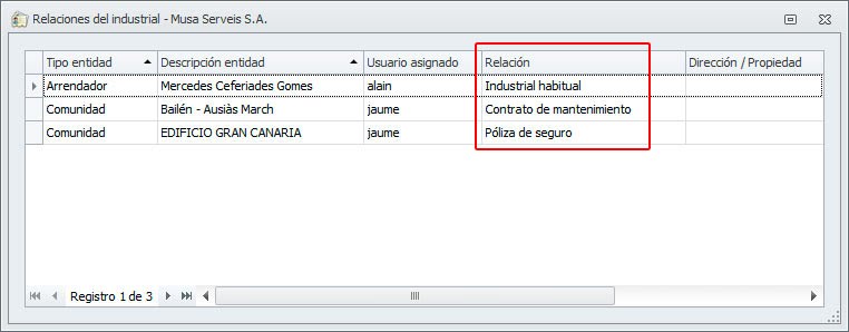 En la lista de relaciones del industrial se informa en la columna relación si el industrial está relacionado a una póliza de seguro, contrato de mantenimiento o si es un industrial habitual de la comunidad, macro-comunidad o arrendador.
