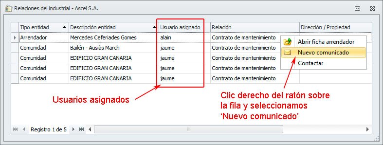 En la lista de relaciones del industrial, se ha añadido un campo donde se muestra el usuario asignado a la comunidad, macro-comunidad o arrendador con el que se relaciona el industrial. Haciendo clic derecho y seleccionando la opción ‘Nuevo comunicado’ se le podrá enviar un comunicado.