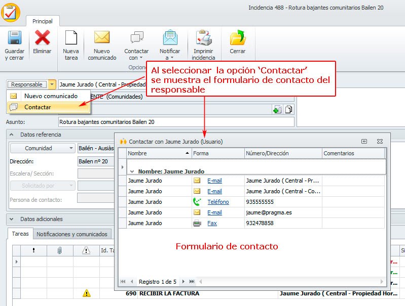 Desde la ficha de la incidencia a través de la opción ‘Contactar’ del menú asociado al usuario ‘Responsable’, se puede contactar con él.