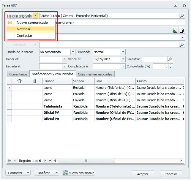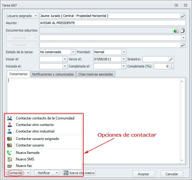 Desde la ficha de la tarea a través de la opción ‘Contactar’ del menú asociado al ‘Usuario asignado’, se puede contactar con él.