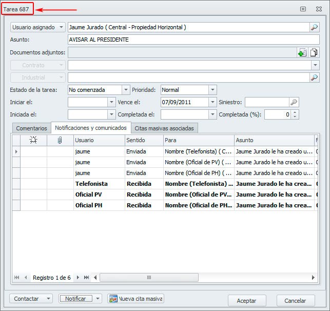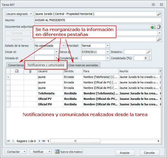 Se ha añadido una nueva sección de ‘Notificaciones y comunicados’ en la ficha de la tarea. Aquellos comunicados y notificaciones que se envíen desde la tarea quedarán registrados en esta sección. Se ha reordenado la ficha añadiéndose tres pestañas, una para los comentarios, otra para las citas masivas y otra para la nueva sección ‘Notificaciones y comunicados’.