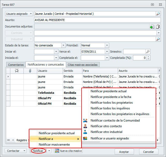 Disponemos de un nuevo menú que agrupa las diferentes posibilidades de notificar. Accedemos a este menú desde la propia ficha de la tarea botón ‘Notificar’ o haciendo clic derecho sobre la tarea en la lista de tareas ubicada en la ficha de la incidencia opción: ‘Notificar a’.