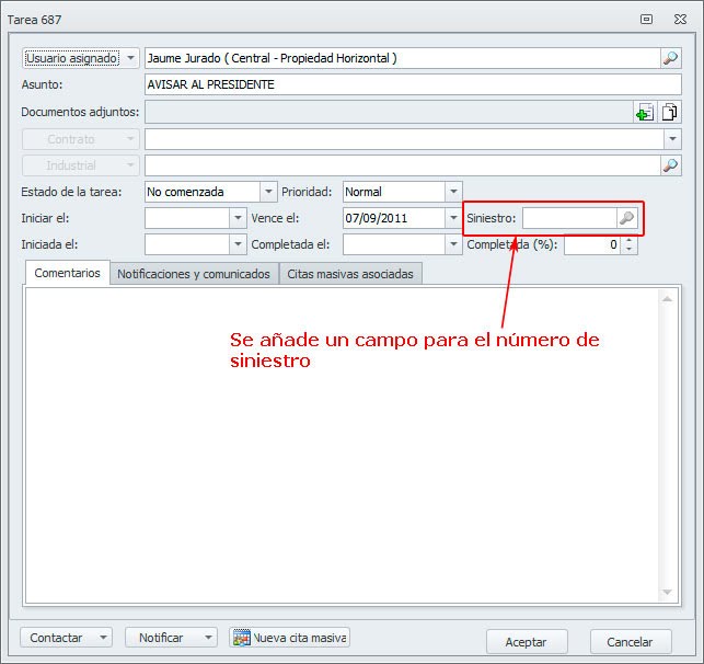 Se añade el campo número de siniestro en las tareas, de esta manera se puede introducir el número de siniestro recibido desde una compañía de seguros.
