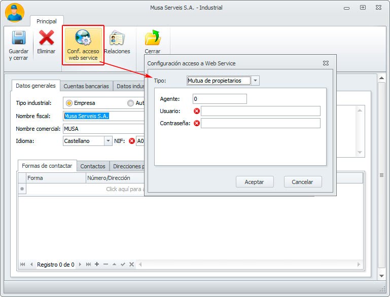Desde la ficha del industrial se configura la conexión para la consulta del estado del siniestro, únicamente cuando se trate de la Mutua de Propietarios.