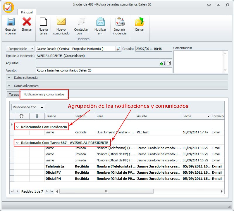 En la lista de ‘Notificaciones y comunicados’ de la incidencia se ha agrupado el listado por el campo ‘Relacionado con’ que indica si la notificación o comunicado se ha enviado desde la incidencia o desde la tarea.
