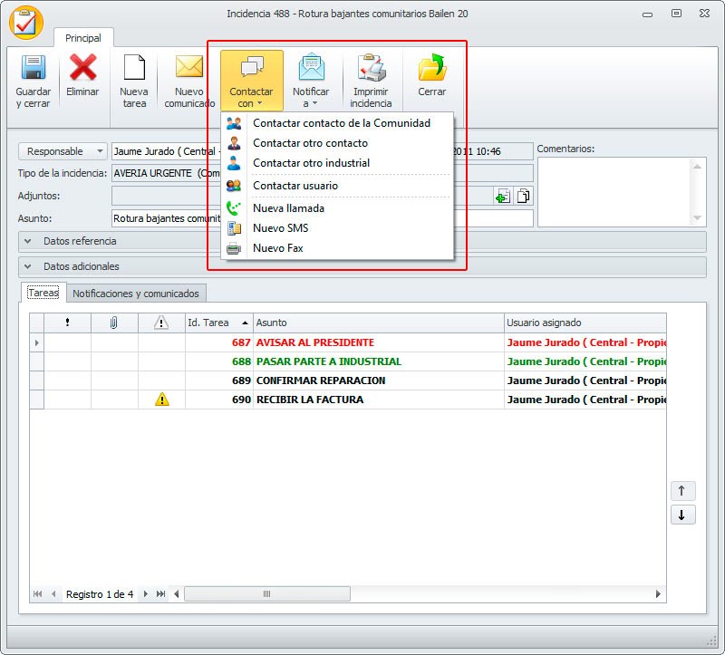 Disponemos de un nuevo menú que agrupa las diferentes posibilidades de contactar. Accedemos a este menú desde la propia ficha de la tarea botón ‘Contactar’ o haciendo clic derecho sobre la tarea en la lista de tareas ubicada en la ficha de la incidencia opción: ‘Contactar con’.