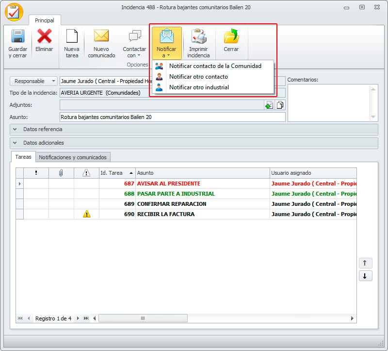 Se añaden nuevas opciones de notificar dentro de la ficha de la incidencia. Están agrupadas en el botón ‘Notificar a’.