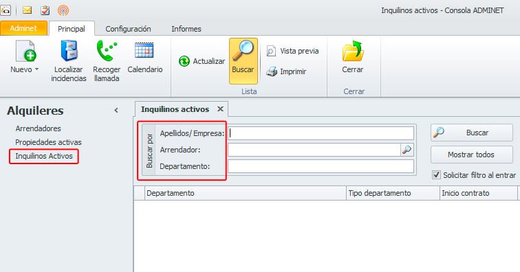 En el módulo ‘Alquileres’ se ha añadido el submenú ‘Inquilinos activos’ que permite listar los inquilinos activos. Se pueden realizar búsquedas por nombre del inquilino, arrendador o departamento.