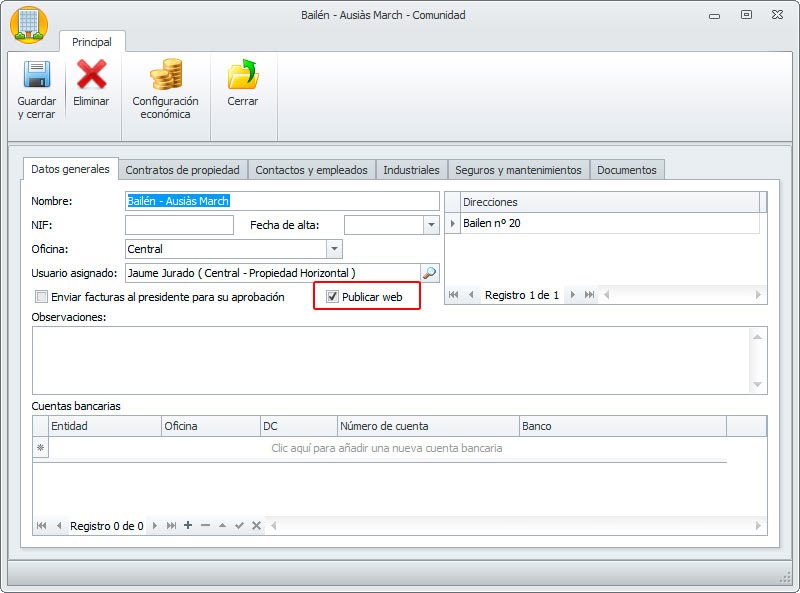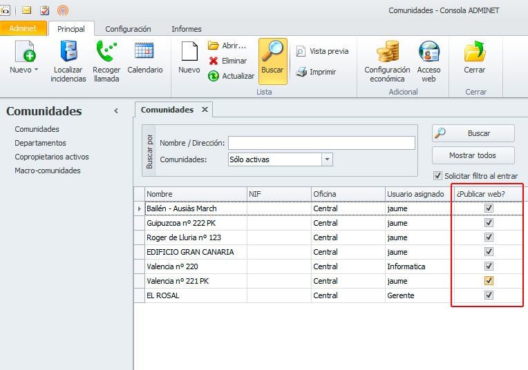 Desde la ficha de la comunidad, a través de la casilla de verificación ‘Publicar Web’ se puede habilitar o deshabilitar la publicación de los datos de una comunidad en Admiweb. Por ejemplo: Al dar acceso Web a un copropietario, se le está dando acceso a todas sus comunidades. Si alguna de ellas no tiene contratado el servicio Web, se podrá deshabilitar el acceso de esa comunidad en concreto, de esta manera el copropietario solo tendrá acceso a la comunidad habilitada.