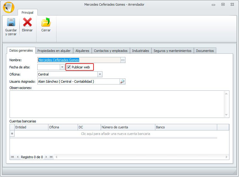 Desde la ficha del arrendador, a través de la casilla de verificación ‘Publicar Web’ se puede habilitar o deshabilitar la publicación de los datos de un arrendador en Admiweb.