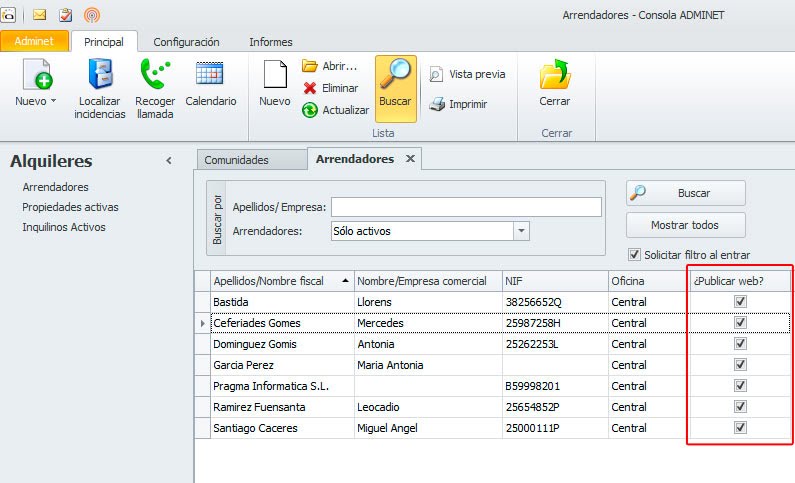 En la lista de arrendadores, se ha añadido una columna que indica si el arrendador se publica en Admiweb.