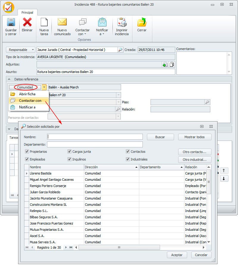 Desde el botón desplegable de la comunidad, macro-comunidad o arrendador ubicado en la referencia, se añade la opción de ‘Contactar con’. Esta opción permite obtener una lista de contactos vinculados a la comunidad, macro-comunidad o arrendador y poder contactarlos. Por ej. Copropietarios, inquilinos, cargos junta…