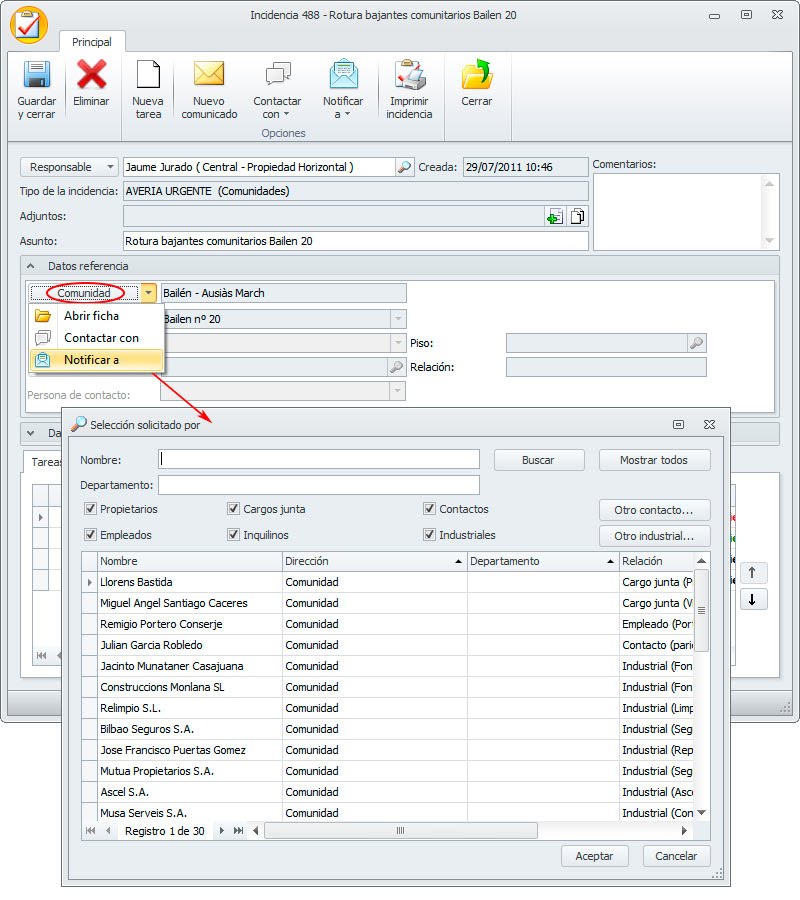 Desde el botón desplegable de la comunidad, macro-comunidad o arrendador ubicado en la referencia, se añade la opción de ‘Notificar a’. Nos permite obtener una lista de contactos vinculados a la comunidad, macro-comunidad o arrendador y poder notificarlos. Por ej. Copropietarios, inquilinos, cargos junta…