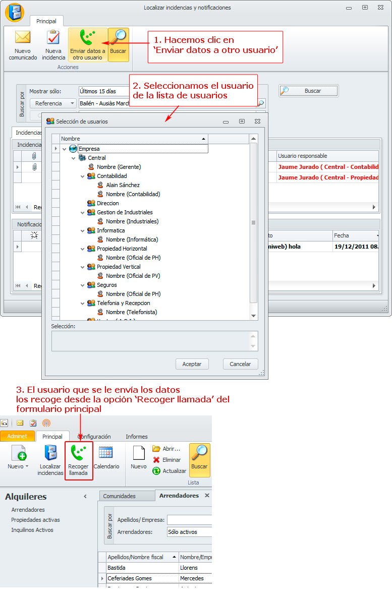 Poder enviar los datos de búsqueda del formulario ‘Localizar incidencia’ a otro usuario. Por ejemplo, si la recepcionista recibe una llamada e identifica a la persona que llama, puede antes de traspasar la llamada telefónica, enviar los mismos datos de la pantalla de ‘Localizar incidencia’ al usuario que traspasa la llamada, evitando a éste, volver a realizar la búsqueda. El usuario que recibe la llamada deberá hacer clic en el icono ‘Recibir llamada’.