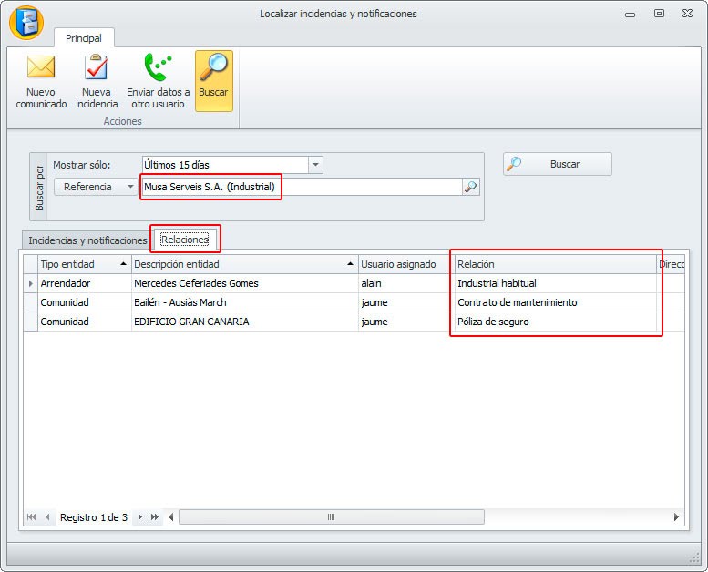 Desde la pantalla de 'Localizar incidencias', al introducir en el campo ‘Referencia’ un industrial, aparece una pestaña con las relaciones del industrial. Podemos ver en donde es ‘Industrial habitual’ o a que ‘Contrato de mantenimiento’ o ‘Póliza de seguro’ está vinculado.