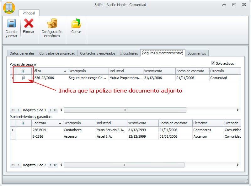 Las listas de contratos de mantenimiento y pólizas de seguro ubicadas en las fichas de la comunidad, macro-comunidad o arrendador, se ha añadido un campo que indica si dicha póliza o contrato lleva documento adjunto.