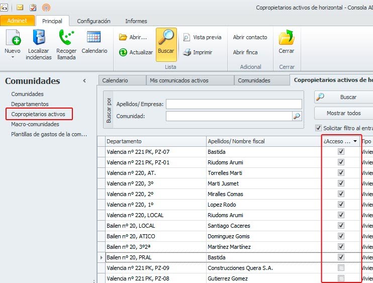 En la lista de copropietarios activos se ha añadido una columna que indica si el copropietario tiene acceso a Admiweb.
