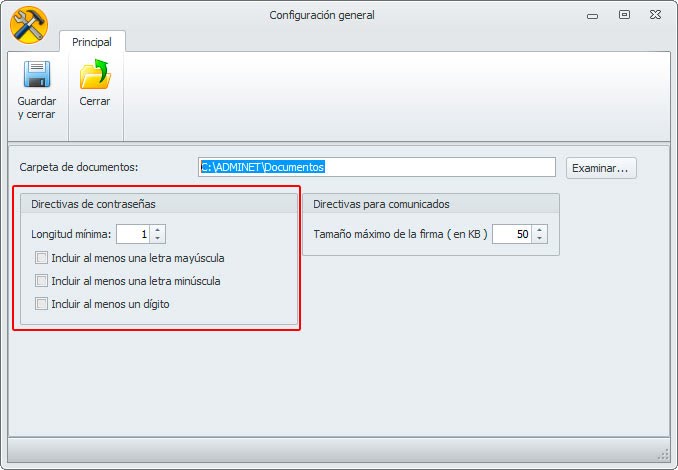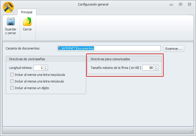 Desde la herramienta de configuración del servidor de Adminet, ubicada en el panel de control, en la sección 'Directivas para comunicados' podemos establecer el tamaño de la firma de los comunicados.