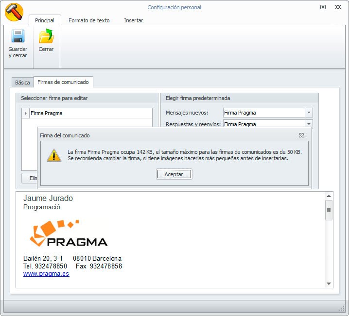 Para firmas existentes, se impedirá su carga en el comunicado cuando la firma supere el tamaño especificado y para firmas nuevas, el sistema impedirá guardar las firmas que superen el tamaño establecido en dicha directiva.