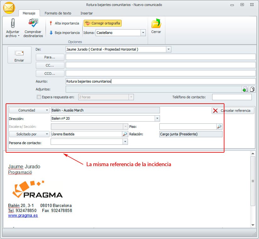 Al enviar un comunicado desde la opción ‘Nuevo comunicado’ ubicada en la ficha de la incidencia o la ficha de la tarea, se añade a la referencia del comunicado los mismos valores que se encuentran en la referencia de la incidencia.