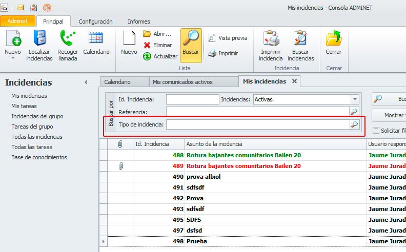 En la lista de incidencias y tareas, se ha añadido un nuevo campo que permite filtrar incidencias por su tipo.