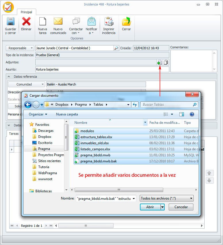 Se pueden añadir múltiples documentos de una sola vez en la ficha de la incidencia y ficha de la tarea.