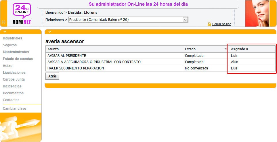 Se dará la posibilidad de mostrar el usuario asignado a las incidencias y tareas en Admiweb. Esta opción está controlada por un permiso que se puede definir independientemente para cada rol del portal ("Presidente", "Propietario" y "Arrendador").