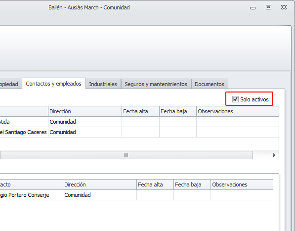 Dentro de la pestaña ‘Contactos y empleados’ de la ficha de la comunidad, se ha añadido la casilla ‘Solo Activos’ para listar únicamente aquellos contactos y empleados activos. Si queremos verlos todos (activos y dados de baja), desmarcamos la casilla y se mostraran todos.