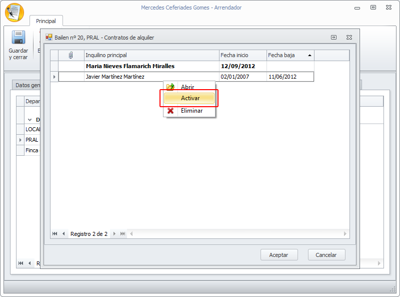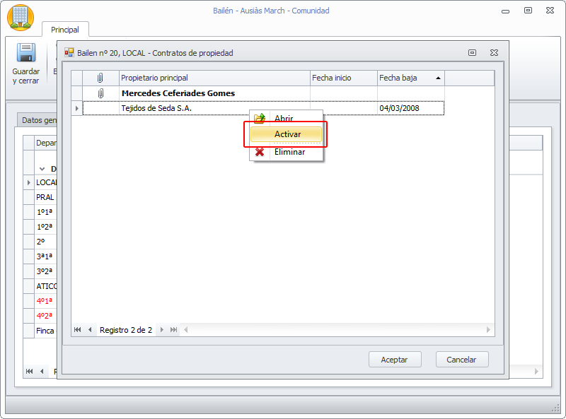 Desde el histórico de contratos de propiedad de un piso de horizontal, se ha añadido la opción de activar contratos dados de baja. Al activar un contrato de propiedad dado de baja, el contrato activo pasa a estar de baja a la fecha actual.