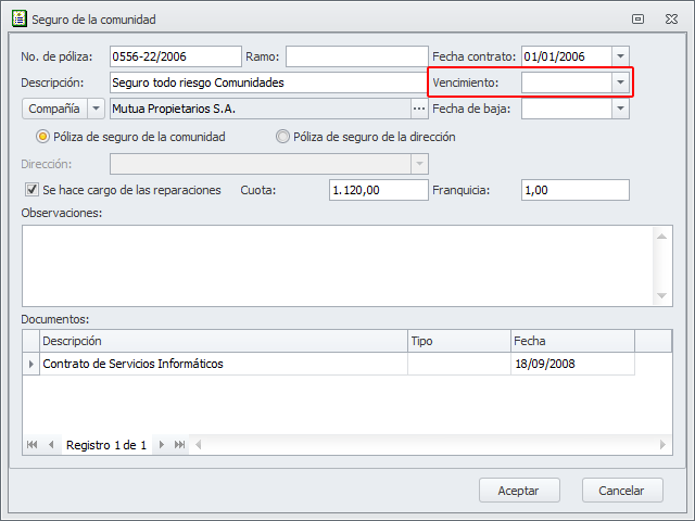 Se permite valores nulos (vacíos) en el campo vencimiento de un contrato de mantenimiento o una póliza de seguro asociados a una comunidad, macro-comunidad o arrendador.