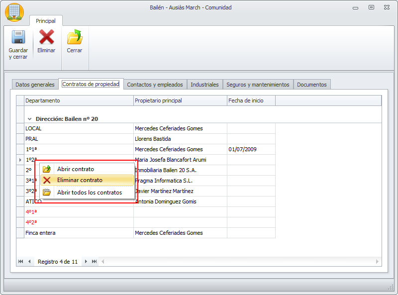 Se permite eliminar los contratos de propiedad asociados a una comunidad, haciendo clic derecho del ratón sobre el departamento y seleccionando la opción ‘Eliminar’.