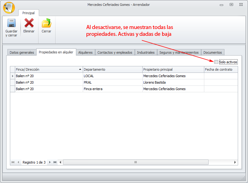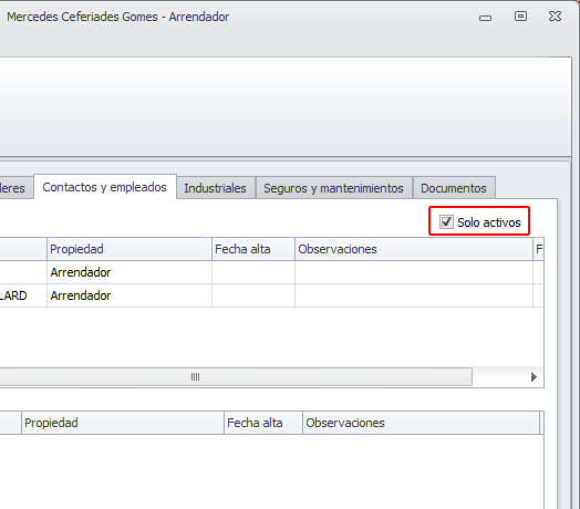 Dentro de la pestaña ‘Contactos y empleados’ de la ficha del arrendador, se ha añadido la casilla ‘Solo Activos’ para listar únicamente aquellos contactos y empleados activos. Si queremos verlos todos (activos y dados de baja), desmarcamos la casilla y se mostraran todos.