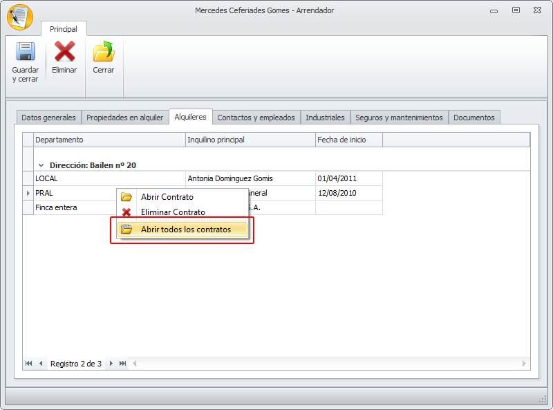 Se permite ver el histórico de contratos de propiedad de las propiedades en alquiler de un arrendador, haciendo clic con el botón derecho sobre la propiedad y seleccionando la opción de ‘Abrir todos los contratos’.