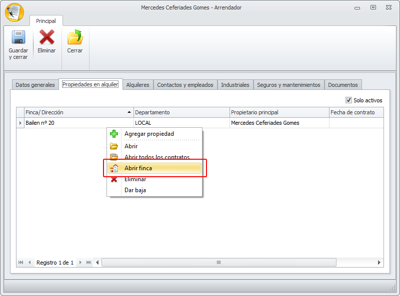 En la lista de propiedades en alquiler dentro de la ficha del arrendador, se ha añadido la opción de ver la finca. Haciendo clic derecho del ratón sobre el departamento, seleccionamos la opción ‘Abrir finca’.
