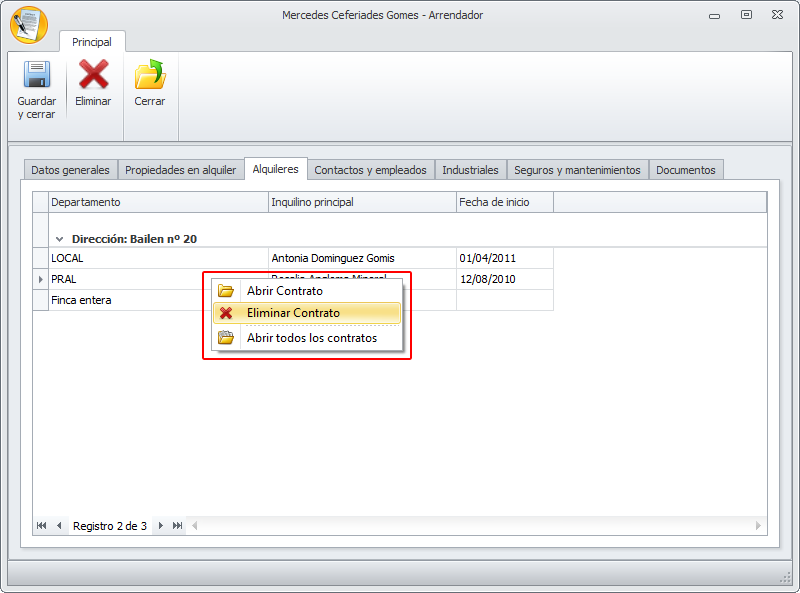 Se permite eliminar los contratos de alquiler asociados a un arrendador, haciendo clic derecho del ratón sobre el departamento y seleccionando la opción ‘Eliminar’.
