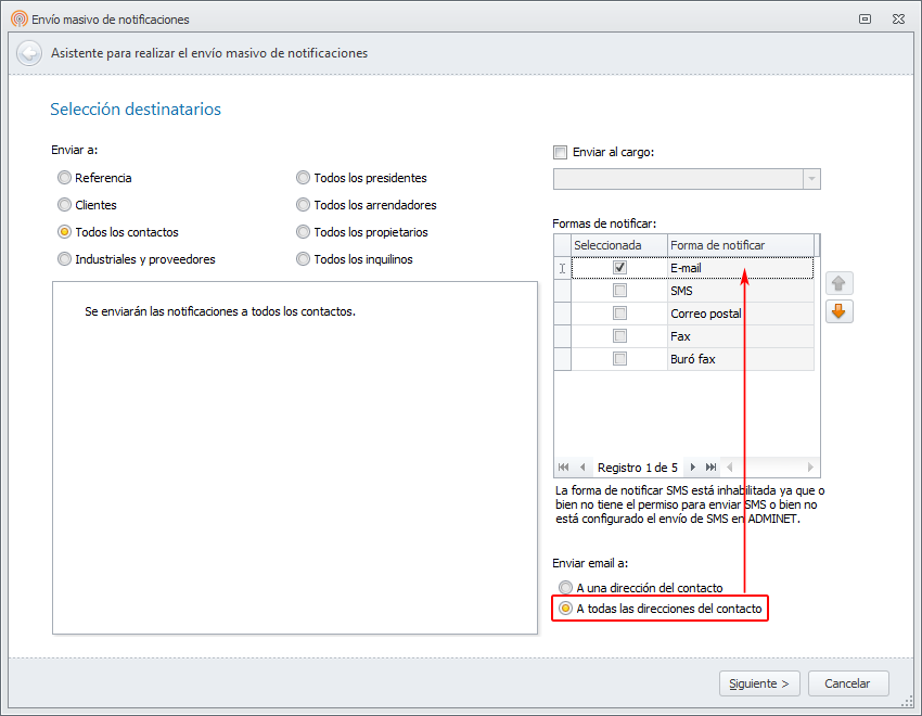 En el envío masivo, se ha añadido la opción de enviar a todas las direcciones de email del contacto. Esto permite que si un contacto dispone de más de una cuenta de e-mail, se le envíe una notificación por cada una de ellas.