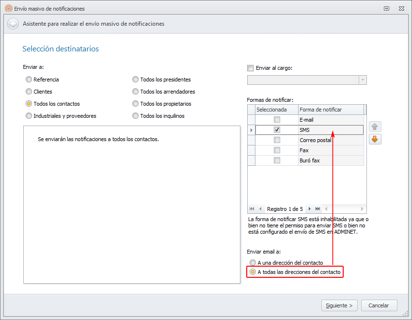 En el envío masivo, se ha añadido la opción de enviar SMS a todos los números de móvil del contacto. Esto permite que si un contacto dispone de más de un móvil, se le envíe una notificación por cada uno de ellos. Para este caso, es necesario tener contratado el envío de SMS a través de Esendex.