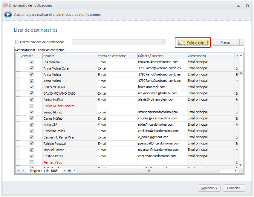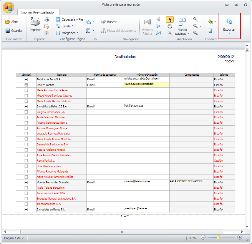 En el envío masivo, se ha añadido la opción de ‘Vista previa’ donde se puede sacar un informe de la lista de destinatarios. Este informe, puede ser exportado posteriormente a múltiples formatos como PDF, HTML, Excel…